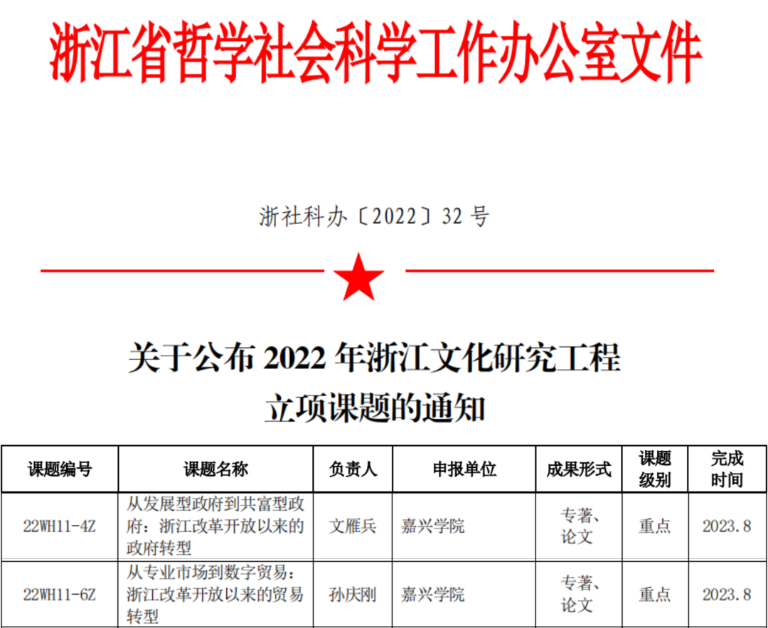 近日,浙江省哲学社会科学工作办公室发布了《关于公布2022年浙江文化研究工程立项课题的通知》。公司文雁兵教授主持的《从发展型政府到共富型政府:浙江改革开放以来的政府转型》、孙庆刚副教授主持的《从专业市场到数字贸易:浙江改革开放以来的贸易转型》两项课题获批2022年浙江文化研究工程重点课题立项。