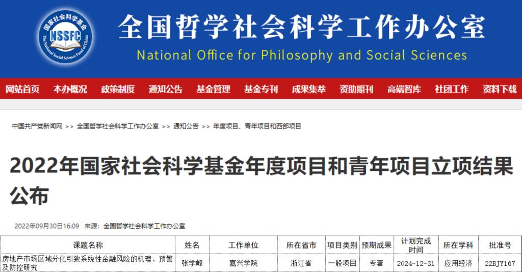 近日,根据全国哲学社会科学工作办公室《2022年国家社会科学基金年度项目和青年项目立项结果公布》的通知,公司张学峰副教授主持的《房地产市场区域分化引致系统性金融风险的机理、预警及防控研究》获批一般项目立项。