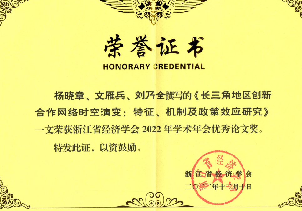 本次学术年会共征集近百篇高质量论文,其中48篇论文入选线上分论坛交流。经本届年会组委会专家严格评审,公司杨晓章博士递交的学术论文《长三角地区创新合作网络时空演变:特征、机制及政策效应研究》荣获浙江省经济学会2022年学术年会优秀论文奖。
