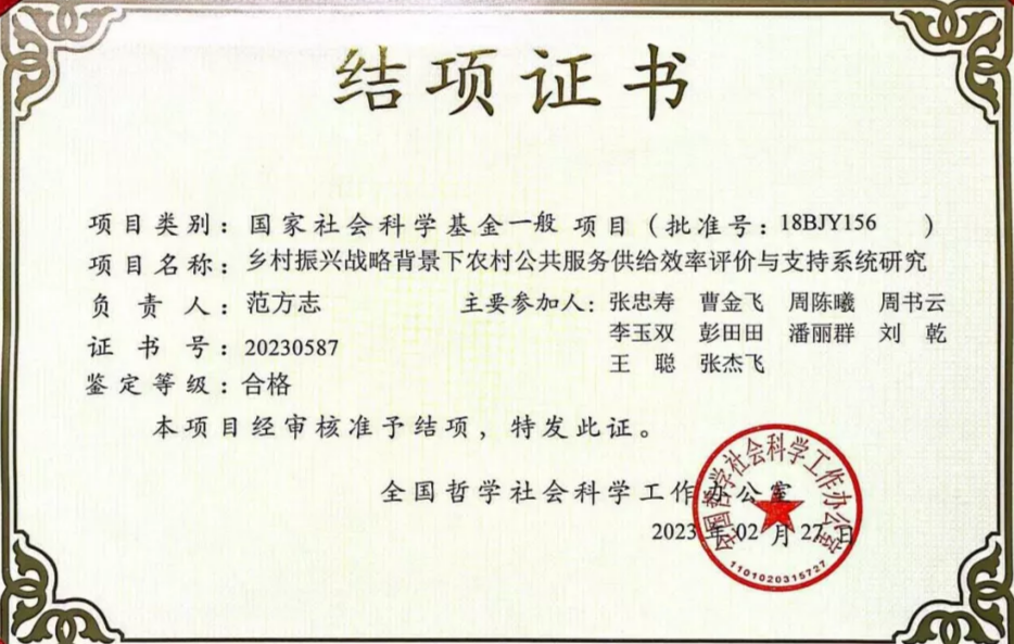 近日,公司范方志教授主持的国家社科基金一般项目“乡村振兴战略背景下农村公共服务供给效率评价与支持系统研究”通过结项验收审批,顺利结项。