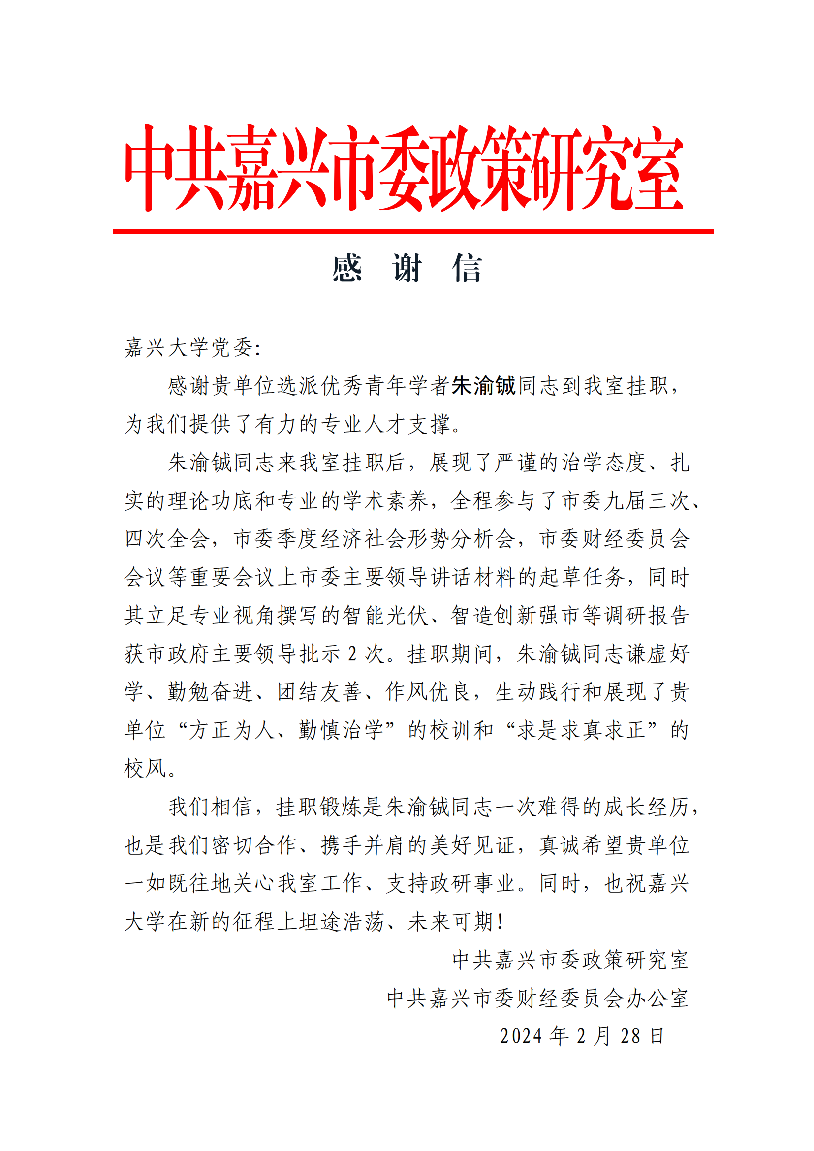 近日,中共嘉兴市委政策研究室发来感谢信,对公司挂职教师朱渝铖博士提出表扬。