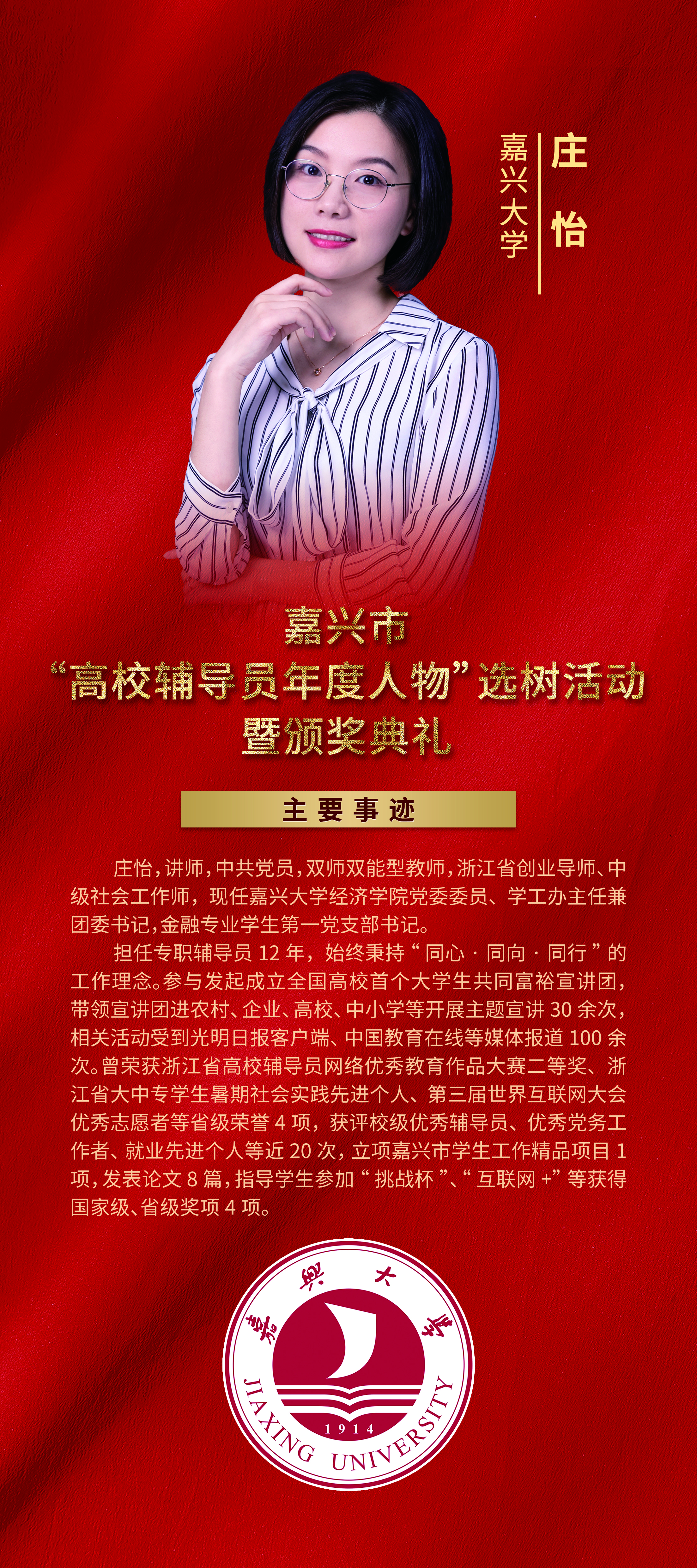经各高校推荐,嘉兴市高校辅导员联盟组织专家进行现场评审,共评选出2023年嘉兴市“高校辅导员年度人物”11名、“高校辅导员年度人物提名”7名,公司辅导员庄怡荣获嘉兴市“高校辅导员年度人物”称号。