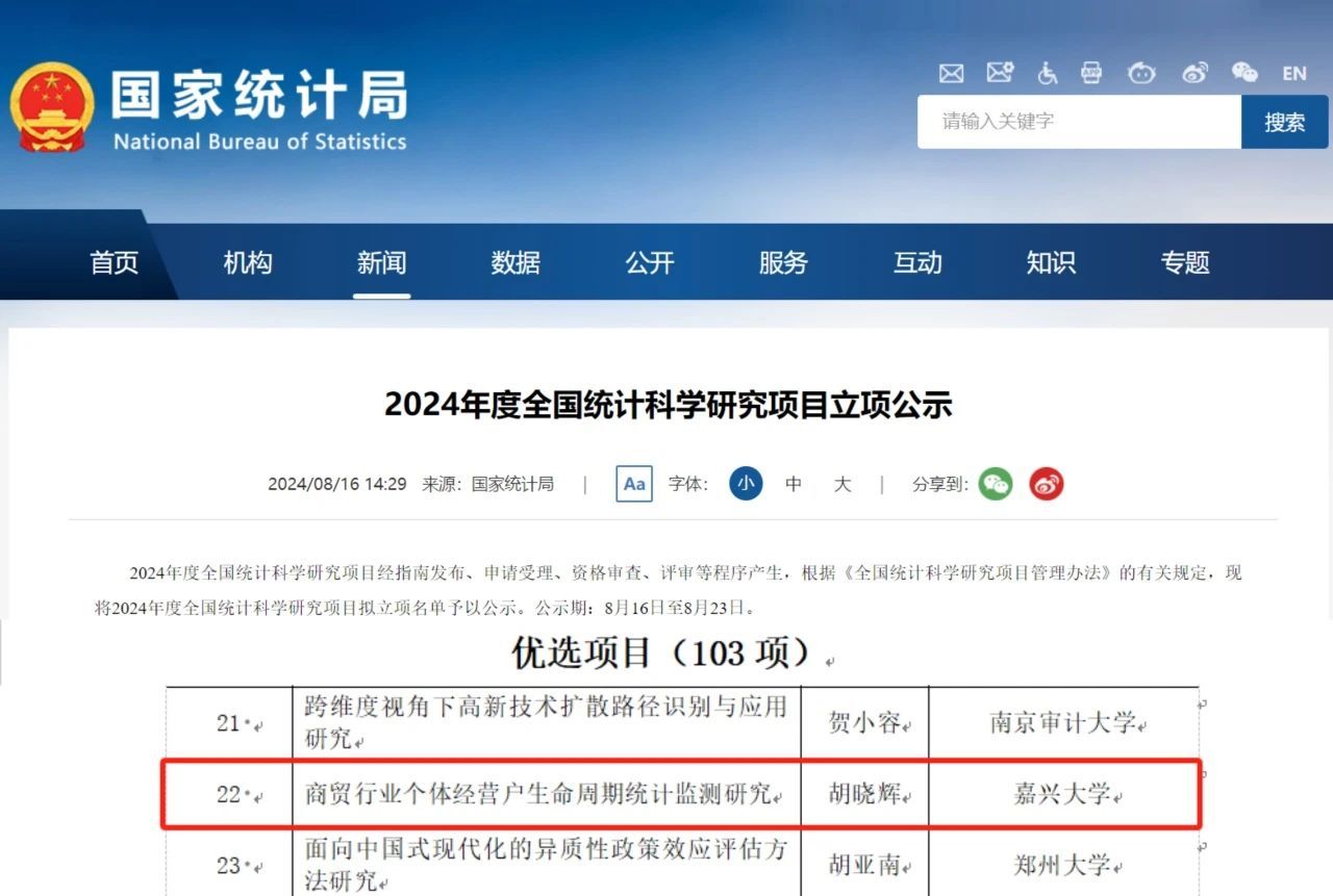 近日,国家统计局发布了《2024年度全国统计科学研究项目立项公示》,公司胡晓辉副教授申报的《商贸行业个体经营户生命周期统计监测研究》获批全国统计科学优选项目立项。这是公司首次获批国家统计局研究项目。