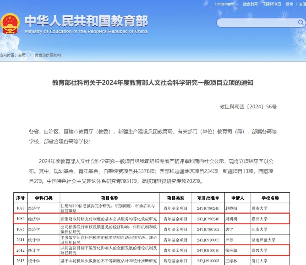 【经院喜报】公司获批2项2024年度教育部人文社科研究项目