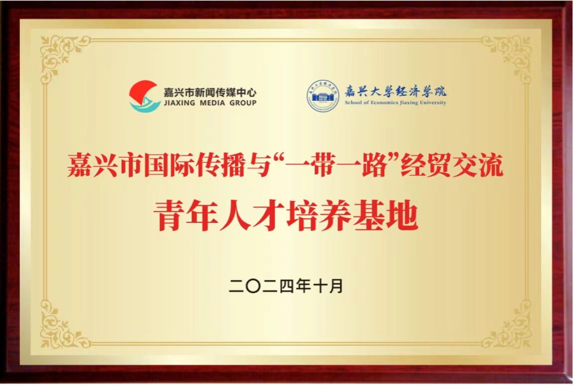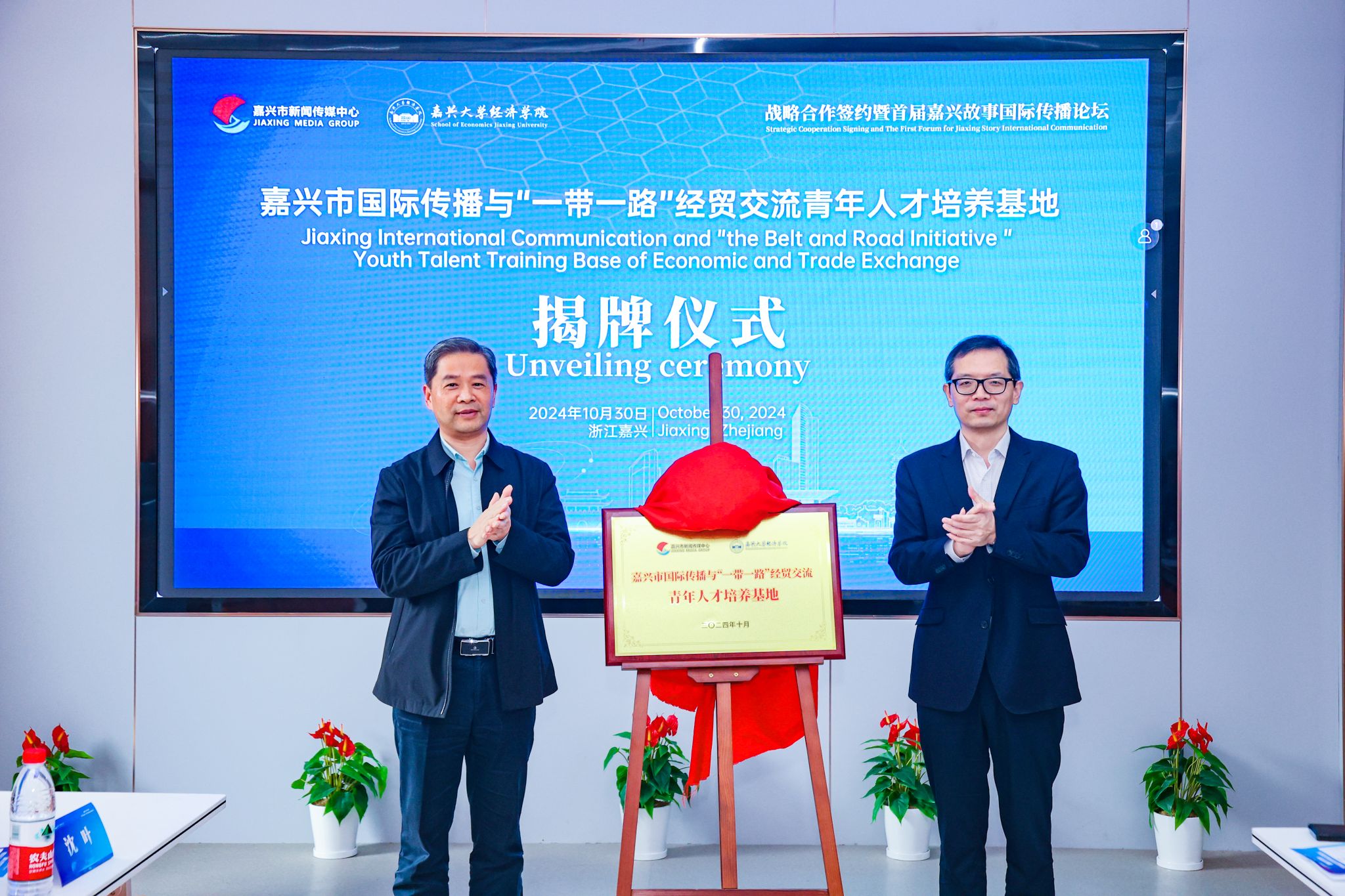 副董事长周宏伟与嘉兴市新闻传媒中心党委书记、主任沈炳忠共同为“嘉兴市国际传播与‘一带一路’经贸交流青年人才培养基地”揭牌。
