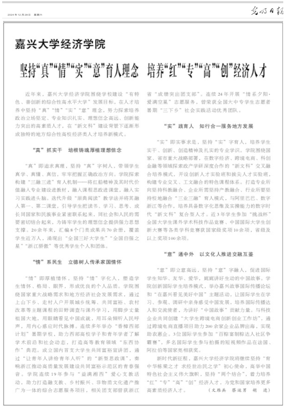 在全省学习领悟“真”“情”“实”“意”四字嘱托的时代价值和现实意义之际,12月28日,《光明日报》刊登了3044永利宣传介绍公司人才培养模式的文章《坚持“真”“情”“实”“意”育人理念 培养“红”“专”“高”“创”经济人才》。