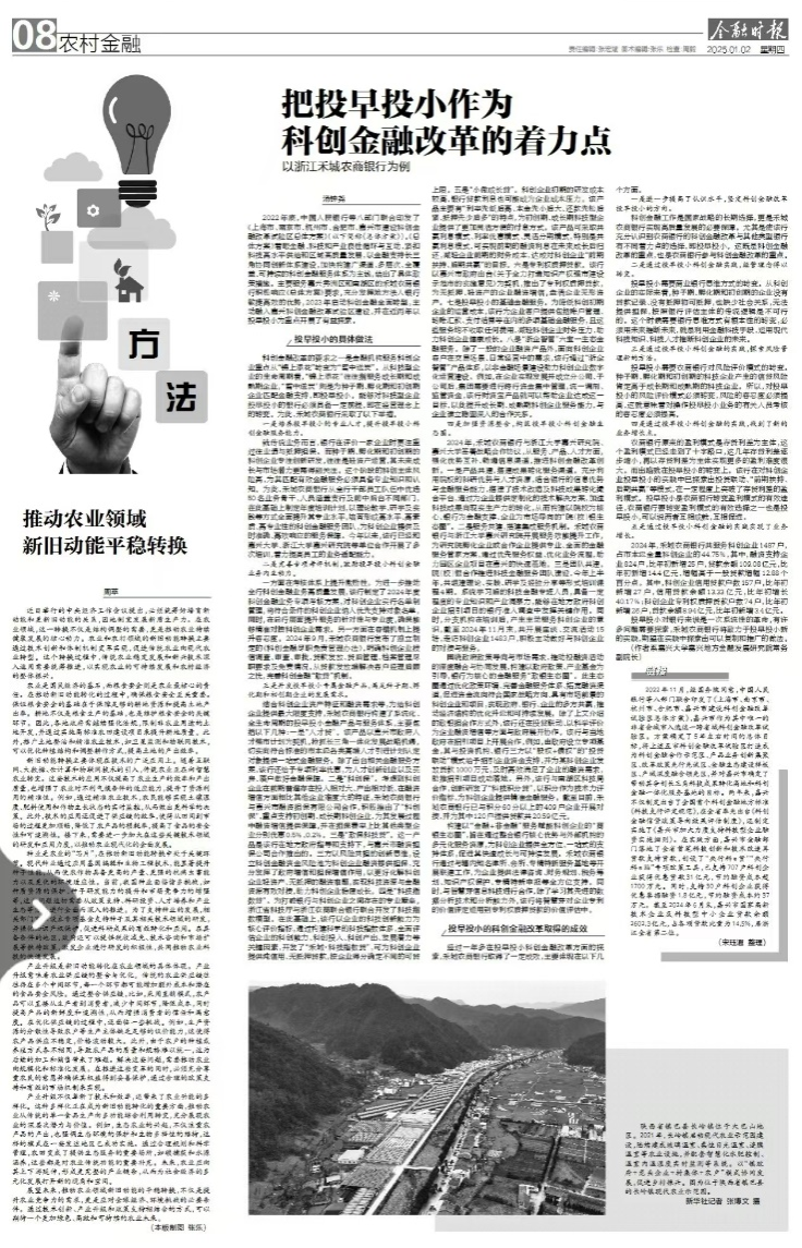 2025年1月2日,公司特聘教授、嘉兴地方金融发展研究院常务副经理汤钟尧在《金融时报》发表研究文章《把投早投小作为科创金融改革的着力点》,以浙江禾城农商行为范例,总结出“培养投早投小的专业人才,提升投早投小科创金融服务能力”“完善专项考评机制,激励投早投小科创金融业务内生动力”“开发投早投小专属金融产品,满足种子期、孵化期和初创期企业的发展需求”“加强资源整合,构筑投早投小科创金融生态圈”四点具体做法和“进一步提高了认识水平,坚定科创金融改革投早投小的方向”“经营理念得以转变”“探索风险管理新的方法”“找到了新的业务增长点”“实现了业务增长”五点成效,为银行投早投小实践提供案例支持并为嘉兴科创金融改革试验区建设贡献力量。