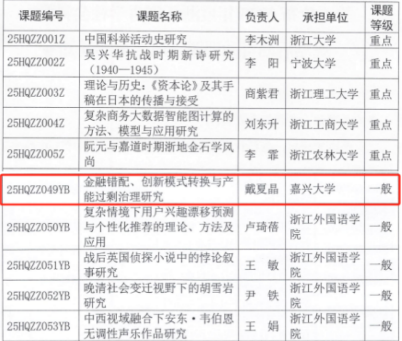 近日,浙江省哲学社会科学工作办公室发布了《关于公布2025年度浙江省哲学社会科学规划后期资助课题立项名单的通知》,公司戴夏晶老师主持申报的《金融错配、创新模式转换与产能过剩治理研究》项目获批立项。
