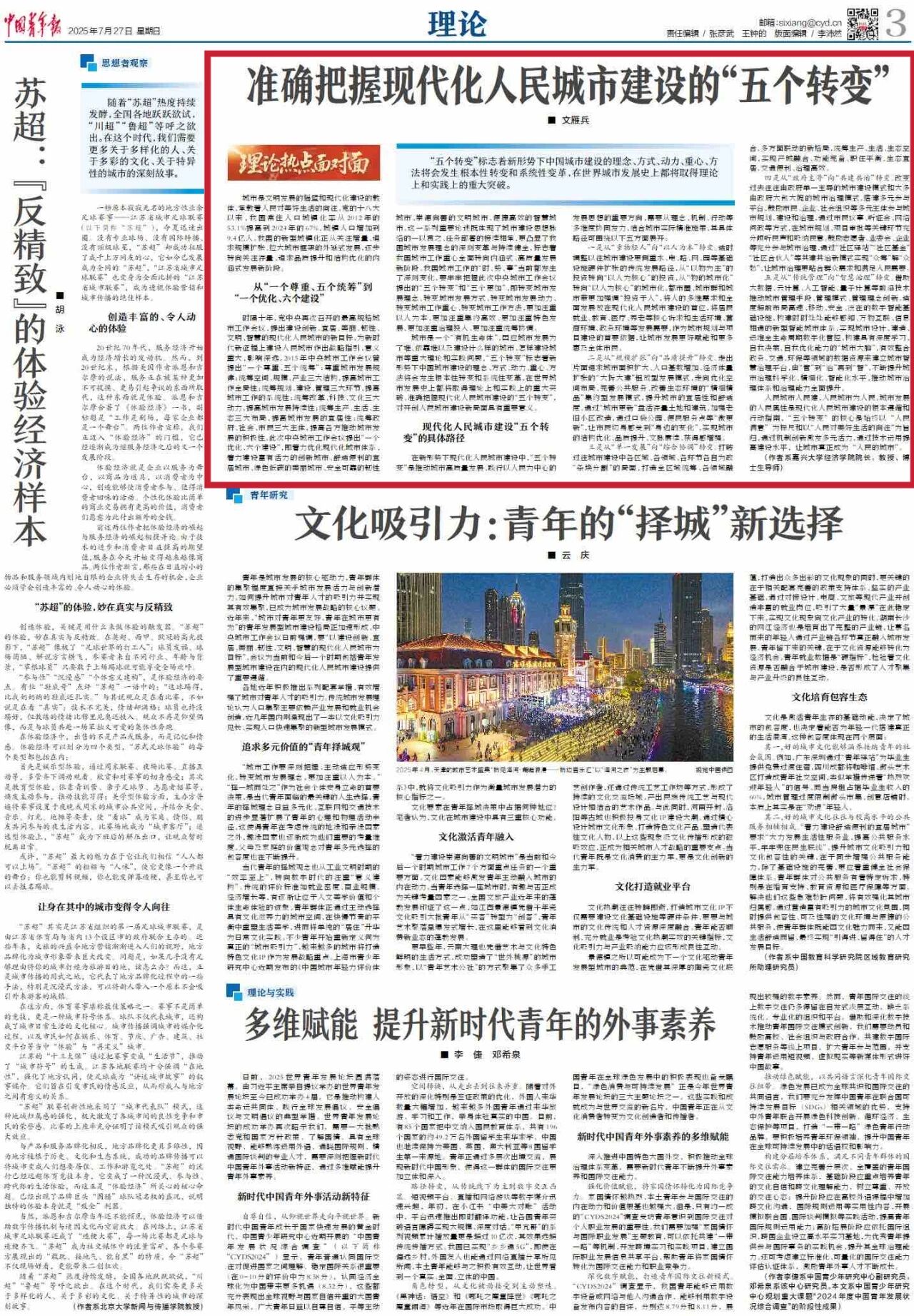 7月27日,公司文雁兵教授在《中国青年报》理论版发表文章《准确把握现代化人民城市建设的“五个转变”》。他指出,“五个转变”标志着新形势下中国城市建设的理念、方式、动力、重心、方法将会发生根本性转变和系统性变革,在世界城市发展史上都将取得理论上和实践上的重大突破。
