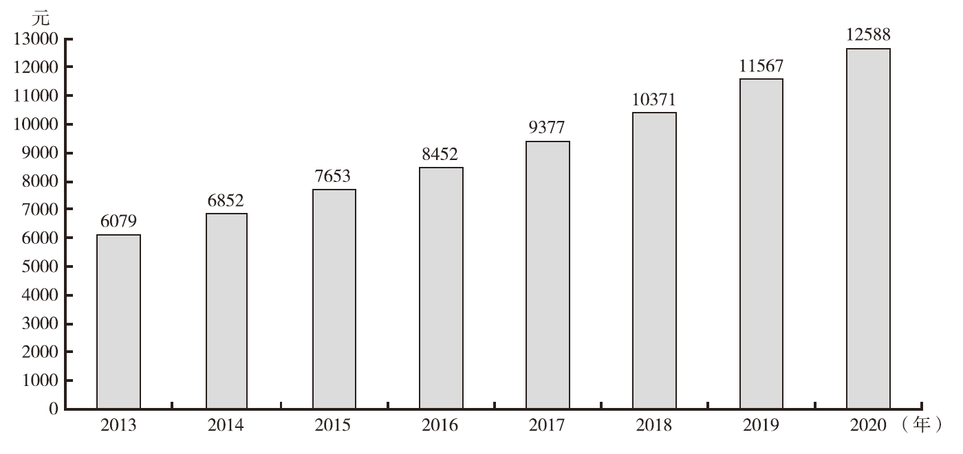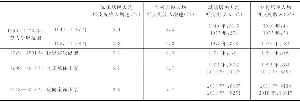 生产力的发展、制度的变迁是由量变到质变的过程,由此决定共同富裕也只能是由渐进到质的飞跃的逐步实现的过程。从中国共产党带领人民不断实现共同富裕的历程看,在生产力极端落后的半殖民地半封建的旧中国,在新民主主义革命几十年进程中,中国共产党领导人民只能在革命老区、抗日根据地、解放区等局部地区,实行土地革命、减租减息、土地改革等措施,逐步地有限程度地解决农民吃饭问题,谈不到富裕,共同也是局部范围的共同。新中国成立七十多年特别是改革开放四十多年来,经过社会主义革命建设和改革发展,我国全面建成了小康社会,按现行标准贫困人口全部脱贫,从总体上说,全体人民实现了从站起来到富起来的飞跃。据国家统计局发布的数据,新中国成立70年来特别是改革开放四十多年来,我国城乡居民收入大幅增长,居民消费水平明显提高。1949年我国居民人均可支配收入仅为49.7元,2018年我国居民人均可支配收入达到28228元,名义增长566.6倍,扣除物价因素实际增长59.2倍,年均实际增长6.1%。按照2010年农村贫困标准,1978年末我国农村贫困人口达7.7亿,2018年末我国农村贫困人口减少至1660万,比1978年末减少约7.5亿。党的十八大以来,收入分配制度改革全面深化实施,重点群体收入增长措施持续发力,精准扶贫精准脱贫政策深入推进,对城乡居民的收入增加起到至关重要的作用。城镇居民人均可支配收入从2013年的26467元增加到2018年的39251元,年均实际增长6.3%。农村居民人均可支配收入从2013年的9430元增加到2018年的14617元,年均实际增长7.7%。伴随着城乡居民收入的跨越式增长,城乡居民的收入来源也从单一走向多元。城镇居民工资性收入不再占据绝对主体,经营、财产和转移性收入比重增加。2018年城镇居民人均工资性收入占人均可支配收入的比重为60.6%,比1964年下降了30.3个百分点。在这样的基础上,即使受新冠病毒疫情的严重影响,2020年,中国经济总量首破100万亿元大关,占世界经济的比重预计为17%左右,经济总量连续11年居世界第二,14亿人口人均收入达到一万美元;全国居民人均可支配收入32189元,比上年实际增长2.1%,农村居民收入增长快于城镇居民;全国卫生健康支出比上年增长15.2%,其中,与疫情防控直接相关的公共卫生支出增长74.9%,住房保障支出增长10.5%,社会保障和就业支出增长10.9%。
