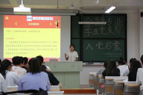 金融专业员工党支部孙懿娴同志介绍了金融专业的在校生人数、员工党员人数,以及党支部设置等情况;同时向新生介绍金融专业员工党支部特色活动:“禾风沐雨”志愿队、“读经·乐融”读书分享会、卫生督察组、查课小组。