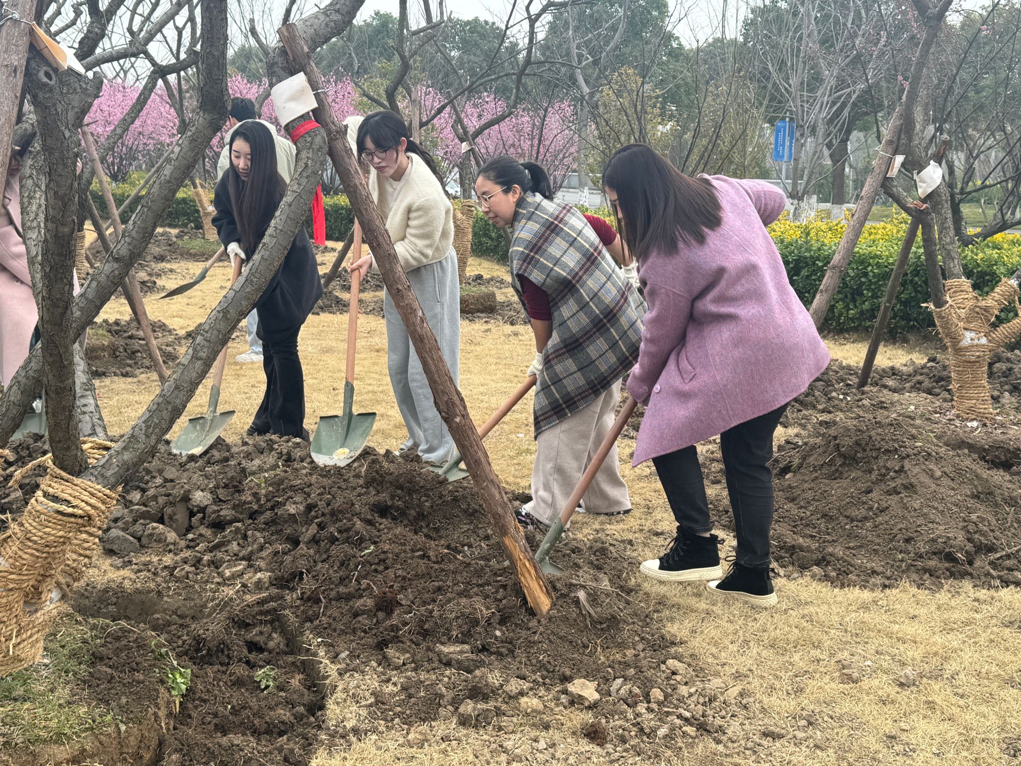 在绿化养护人员的专业指导下,参与植树的师生分工协作,现场一派热火朝天的劳动景象。大家手握铁锹,分工协作,铲土挖坑,扶苗摆正,浇水润苗,亲手种下对嘉大的美好祝福和对未来的美好憧憬,共同助力绿色低碳校园建设。经过辛勤劳动,新种下的树苗迎风挺立,展现出勃勃生机,为明媚的三月增添了绿意。