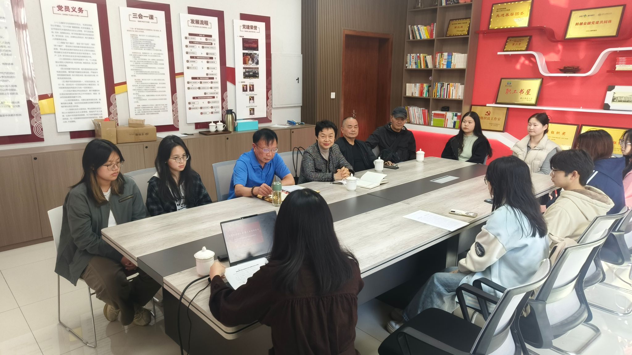 互动交流环节成为活动亮点。离退休教师结合亲身经历,讲述不同历史时期践行党的理论的故事,用岁月沉淀的智慧为青年指引方向;青年员工积极提问,围绕专业学习、职业规划与理论实践结合等话题与前辈深入交流。现场氛围热烈,思想碰撞中凝聚起老少同心、共促发展的共识,实现“银发力量”与青春活力的同频共振。