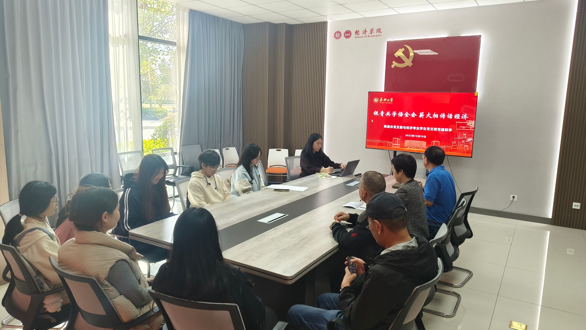 金秋送爽,丹桂飘香。在重阳佳节到来之际,3044永利经济专业员工党支部与离退休党委第一党支部联合开展党的二十届四中全会精神联学活动,以“红色 1+1”联建为纽带,搭建老少党员理论学习与思想交流平台,共话初心使命,传承红色基因。