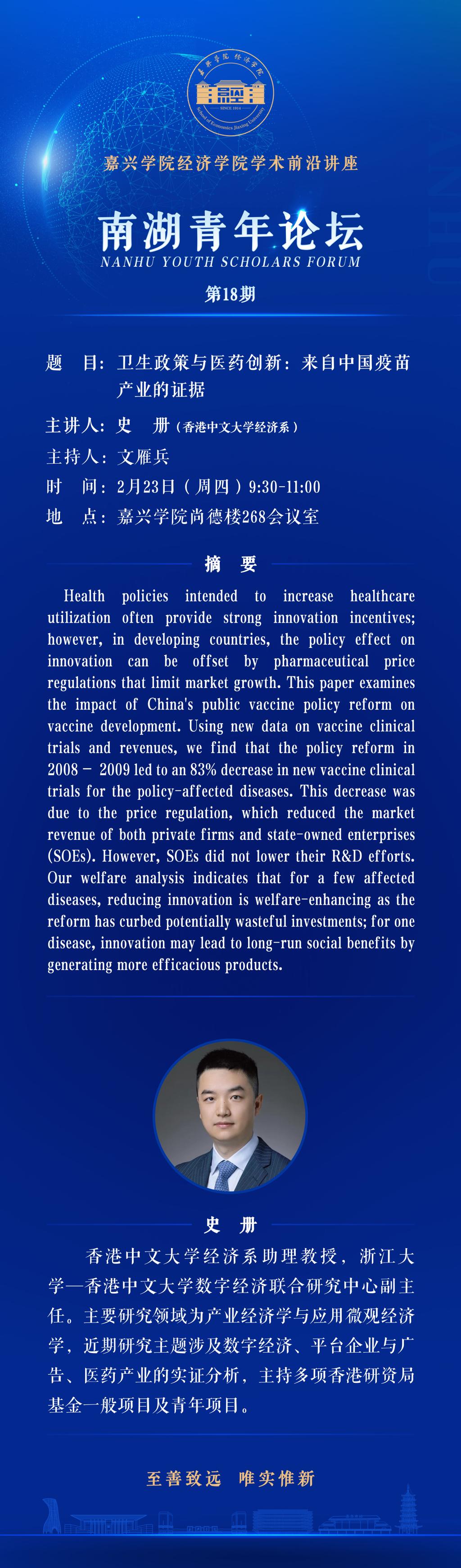 南湖青年论坛NO.18:卫生政策与医药创新:来自中国疫苗产业的证据