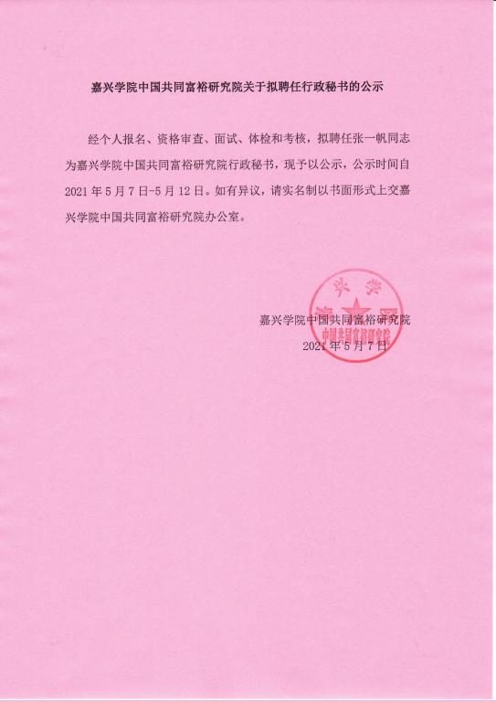 嘉兴公司中国共同富裕研究院关于拟聘任行政秘书的公示
