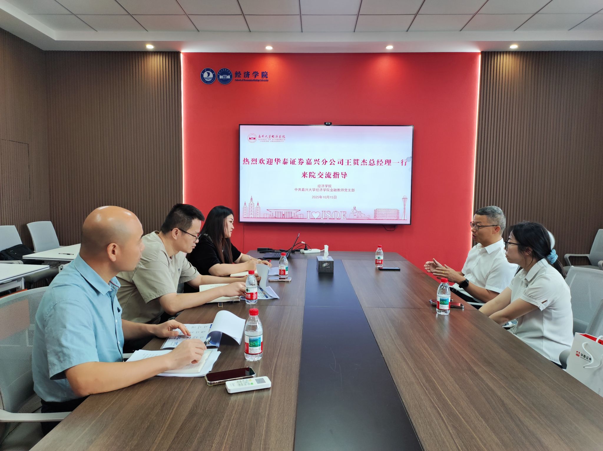 为深化院企合作,探索党建与业务深度融合新路径,2025年10月15日上午,公司金融教师党支部与华泰证券股份有限公司嘉兴分公司举行座谈交流会。华泰证券嘉兴分公司总经理王贯杰、公司党委书记蔡运男、金融教师党支部副书记张学峰、公司研究生竞赛基地主任钱大可参加座谈。双方围绕人才培养、产教融合、金融实践教学及党建促进业务发展等议题进行了深入探讨。